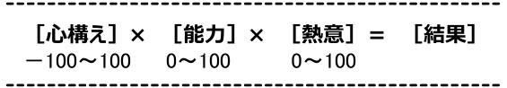 「心構え」が「行動」の90~95%を支配していますから、「結果」は「心構え」次第なのです。 「心構えがすべて」(Mental attitude is everything )といわれる所以です。このことから「心構え」がマイナスでは、いくら能力や熱意があっても結果はマイナスになってしまうことがわかります。 良い結果を出すには「心構え」がプラスであることが必須なのです。