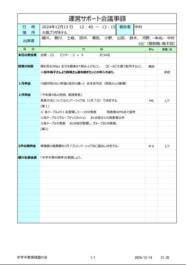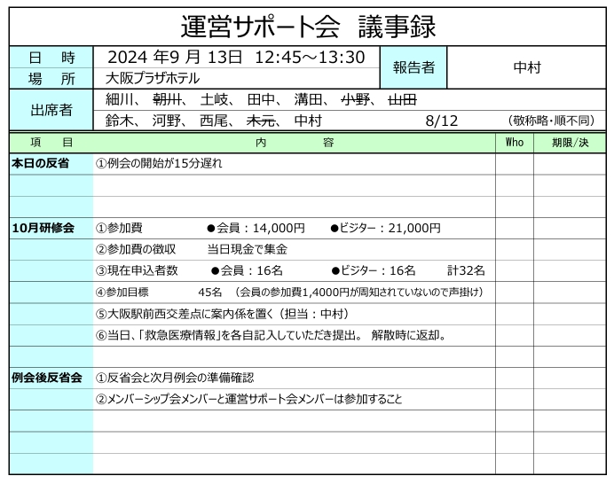 ①メンバーシップ会は毎月第一金曜日15:00より開催。②運営サポート会は月例会後に開催。